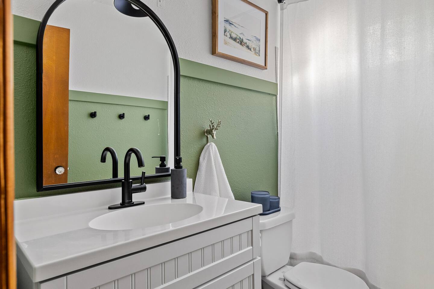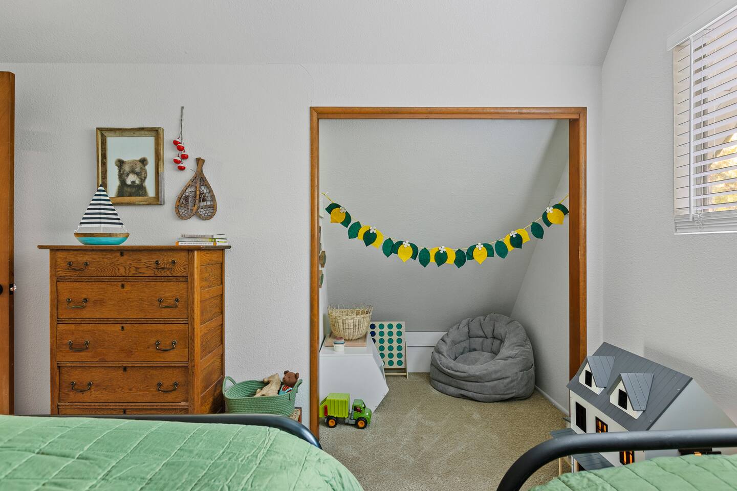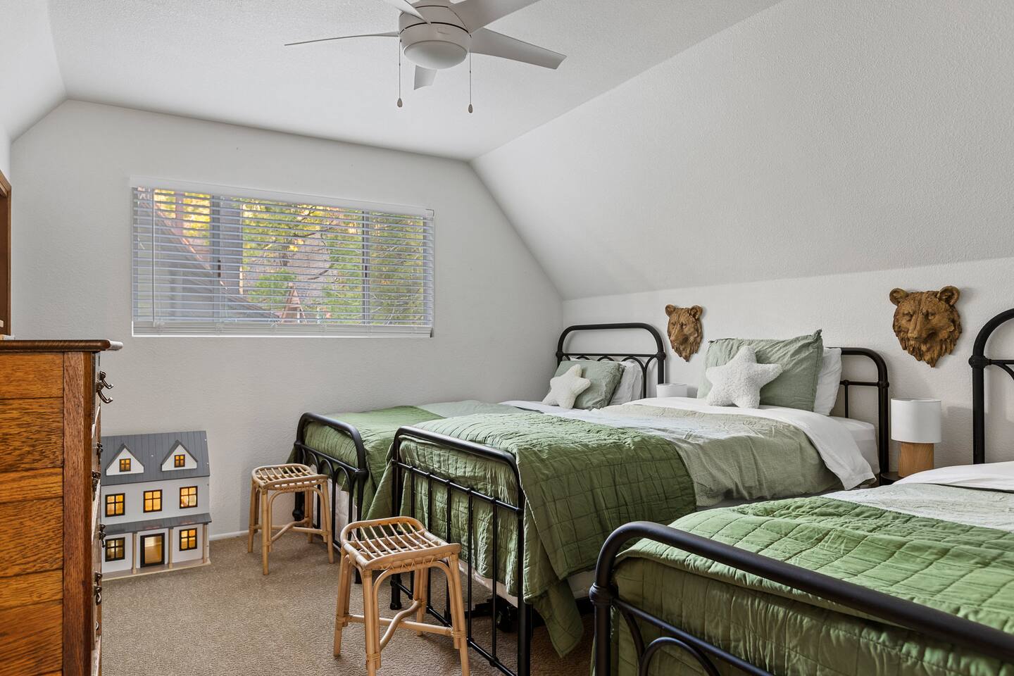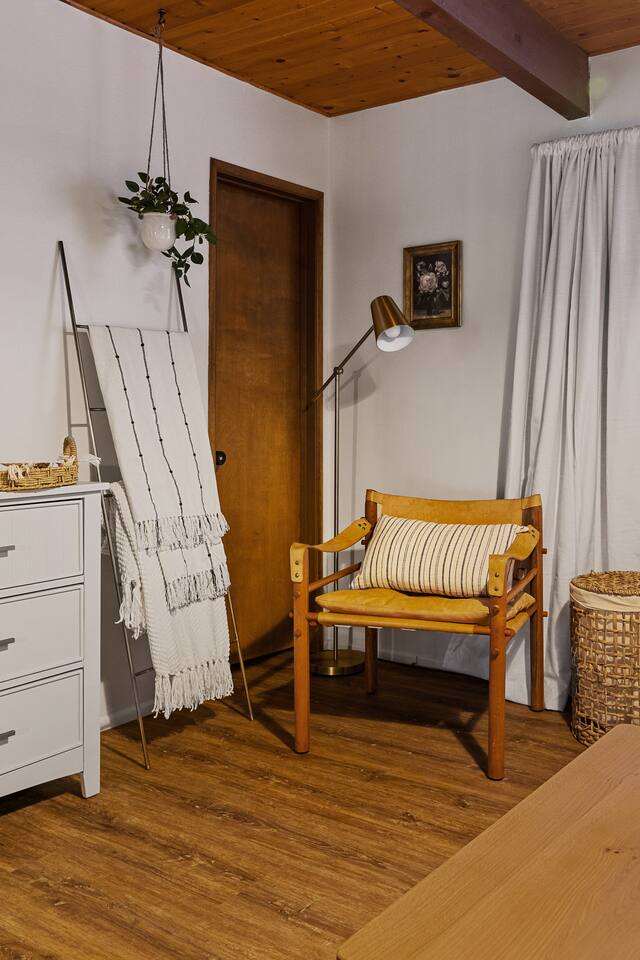Little Bear Cabin has two levels of cozy living while you stay. Take a 5 steps onto the patio and follow the deck around to the front door. Enter on level one and the forest view will greet you. Cook in the fully equipped kitchen and entertain in the dining area. You can also get cozy around the fire and watch some TV (Netflix and other streaming services available). Or just take even more of the view on the front porch (our favorite place to enjoy a cup of coffee). Retire to the primary bedroom with a King bed and adjacent bathroom. Head up the staircase into the kids' room, the perfect hideaway for three little bears. With a dresser to hold all the kid's clothes, toy nook, and dollhouse to keep the little ones busy. Across the hall, you will enter the guest bedroom with a queen bed and a private small deck. And if you absolutely must get on a Zoom call or get some work done, a dedicated workspace will allow you to do so while looking out into the woods. Between these two rooms, there is a full bathroom. Most rooms have black-out curtains to ensure your beauty sleep is uninterrupted. TVs are located in the living room or primary bedroom ( we recommend using the popcorn maker before cozying down to watch a movie). If you are looking to unplug we also have a cabinet full of board games for all ages. Our family favorite is UNO! Central heating is on the wall by the stairs on the main floor. Please only adjust the heating by 4 degrees as to not overwhelm the system. Cooling is felt by opening the windows or using the fans in the upstairs bedrooms, as well as the living room. Our cabin is in the shade, and does stay cooler generally. But we always recommend keeping a the windows open in the hot summer months for a breeze. You can also make a fire. Please do this with great care and follow the instructions we have left for you. We have left enough wood to get you started and warm, but we ask that you supply any additional wood used. All grocery stores and gas stations sell bundles of firewood, so it's easy to find. Little Bear Cabin is in the woods - that means dirt in the summer and snow in the winter. We’d prefer it if you take off your shoes inside please, there’s a shoe rack right at the front door for them. We recommend bringing some slippers to get your cozy going inside. Now allowing pets! Please keep your dog safe by always keeping them on a leash when outside of the cabin. Do not allow your dog to go to the restroom on the deck. Pet policy is $50 fee and max 1 dog allowed. Any dog poop not picked up is a $50 fee
